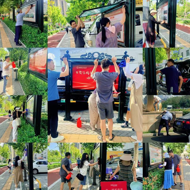 下午 2:30,党员们携带水桶、抹布、清洁剂等工具,准时集合于哈工大路西侧。党员们迅速分工、默契配合 —— 有的俯身擦拭宣传栏底部的积尘,有的踮脚清理高处的顽固污渍,有的细致擦拭 “哈工大星” 标识的纹路缝隙。大家手持抹布反复擦拭,不放过任何一个角落,指尖沾染了灰尘,现场一派热火朝天的劳动景象。“看着宣传栏上的老照片被擦得鲜亮,仿佛能触摸到学校的奋斗足迹,这种‘在劳动中学习’的方式特别有意义。” 参与活动的党员李老师感慨道。