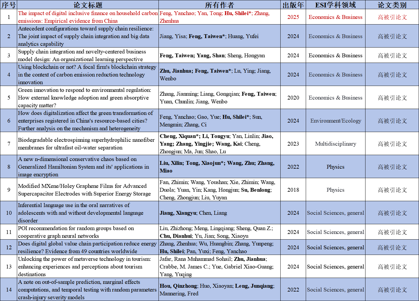 1. 高被引论文(Highly Cited Papers):过去10年内发表的论文,被引频次在该学科相同发表年的论文中排名前1%的论文。
