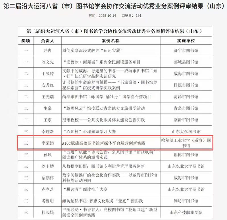 近日,山东省图书馆学会正式公布第二届沿大运河八省(市)图书馆学会协作交流活动评审结果。校区图书馆提报的《AIGC 赋能高校图书馆新媒体平台运营创新实践》业务案例,经专家评审严格遴选,从众多参评项目中脱颖而出,最终斩获 “优秀业务案例三等奖”。