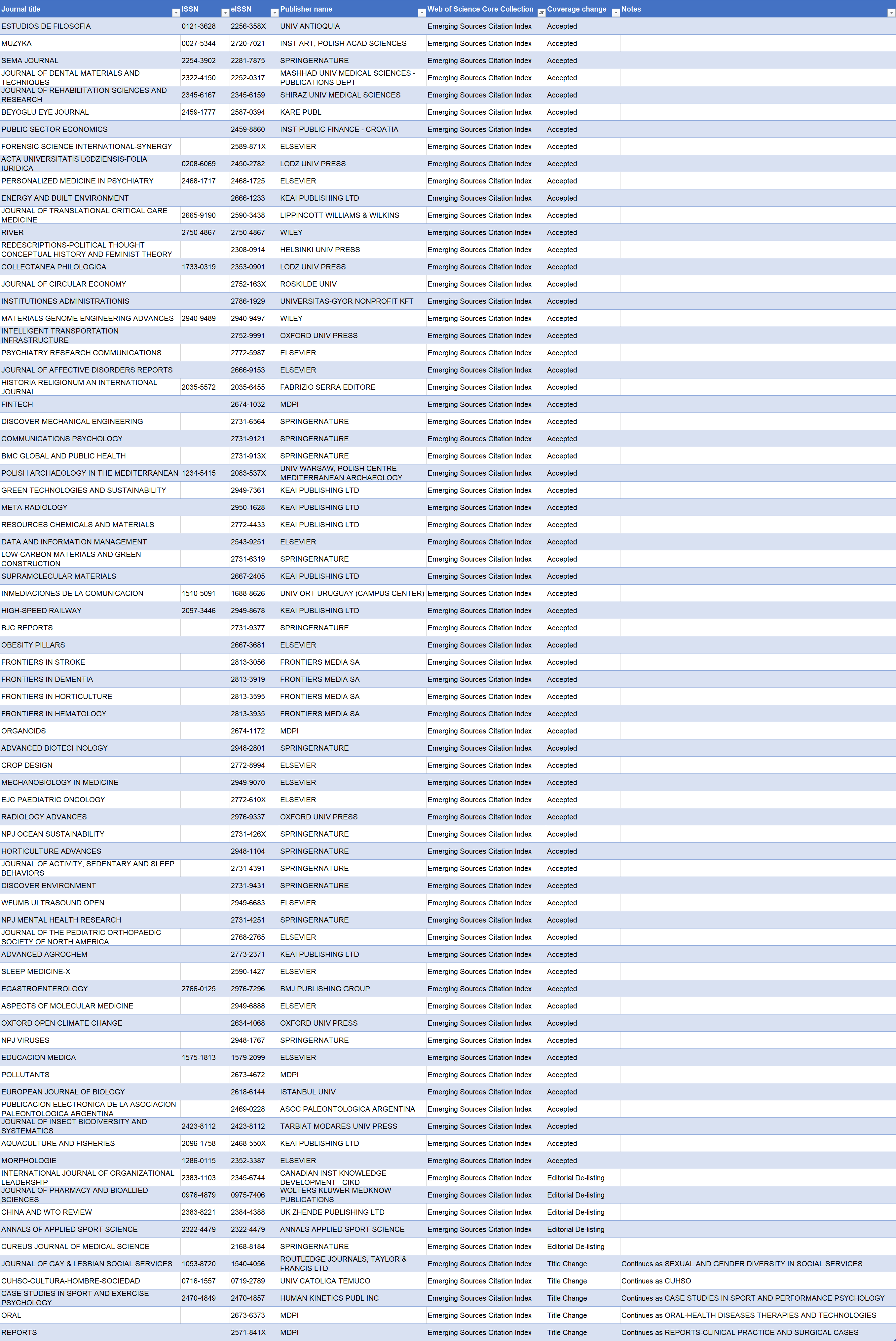 2025年10月ESCI期刊变更详情