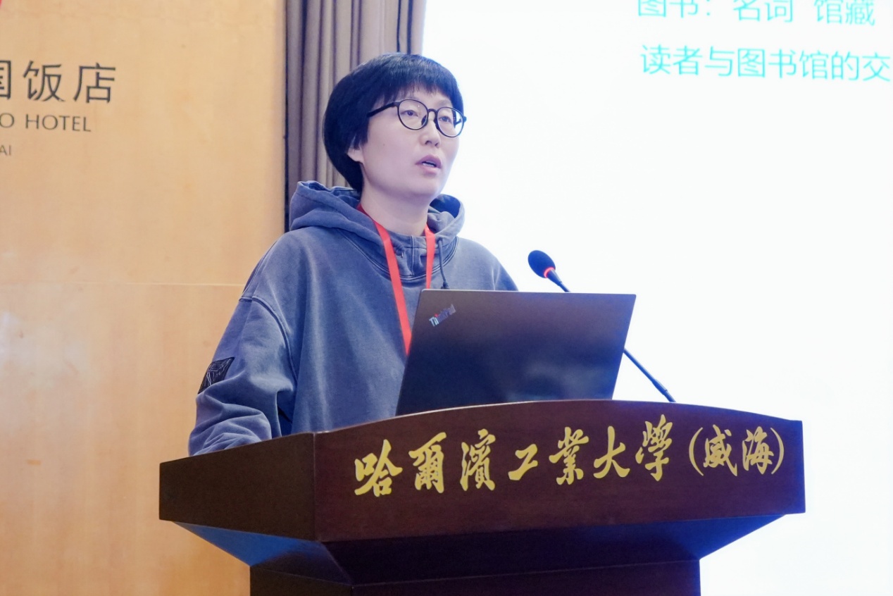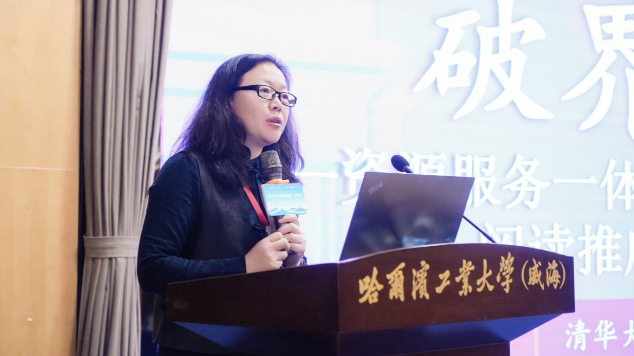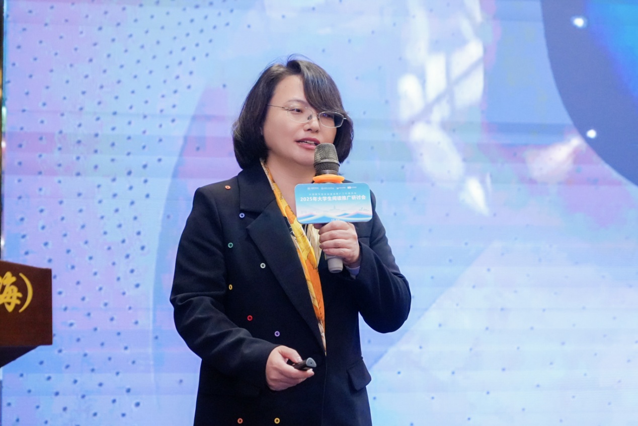 程蓓受山东省高校图书馆情报工作委员会秘书长、山东大学图书馆馆长赵兴胜委托代其致辞,希望通过交流凝聚共识、探索路径、深化合作,在技术赋能中坚守阅读本真与人文传承,推动高校阅读推广工作发展。