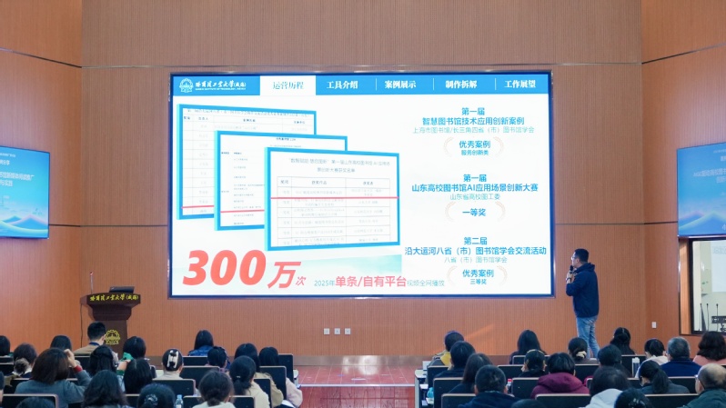 会上,李荣添以《AIGC驱动高校图书馆新媒体阅读推广创新与实践》主题报告,分享了图书馆在AIGC应用领域的探索成果。报告详细介绍了团队依托豆包AI、ChatGPT、即梦AI等国内外多元AI工具,在内容创作、视觉设计、活动策划、品牌IP孵化等方面的实践路径——通过AI生成适配多平台的推广文案、设计活动海报与虚拟场景,打造“哈小图”专属IP形象,制作图书馆使用指南短视频等,实现阅读推广降本增效与品牌升级。同时,还分享了图书馆在AI应用场景创新大赛中的获奖经验,其提出的“AIGC赋能新媒体运营”模式,为人工智能时代高校阅读推广提供了可复制的实践样本,报告现场反响热烈,引发与会同仁深入探讨。
