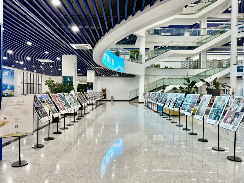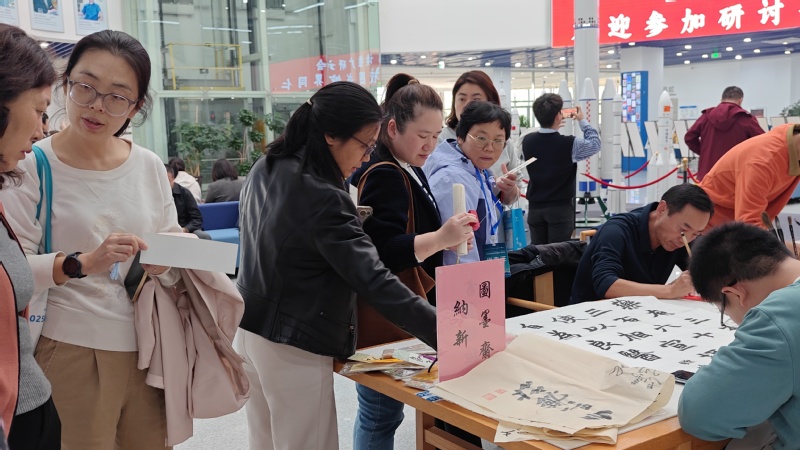 校区图书馆精心策划了系列特色文化活动,让考察过程成为兼具专业价值与文化体验的深度互动。部分代表与毛宏燕就阅读疗法的实践经验进行分享,与校区学子共同参与《非暴力沟通》深度阅读活动,在互动探讨中凝聚共识碰撞专业思路,围绕阅读疗法相关工作进一步深化交流。左国雄与中国石油大学(华东)副馆长陈银吨交流馆舍管理与创收等议题,山东药品食品职业学院馆长姜力源提议两校书画协会互访及书画展交流。左国雄为多所高校嘉宾创作书画作品,现场20余位代表排队求书签题字,部分代表咨询书画协会组织运营相关情况。综合档案室同步开展拓印活动,结合兰台驿社团纳新宣传,让代表们在参观图书馆和茶歇之余,亲手体验中国非遗传统技艺的制作环节,感受传统技艺魅力;阅途文化集团举办的“阅见华章”首届全国高校华服摄影展览,吸引了众多代表的驻足,为交流增添了浓厚的文化韵味。