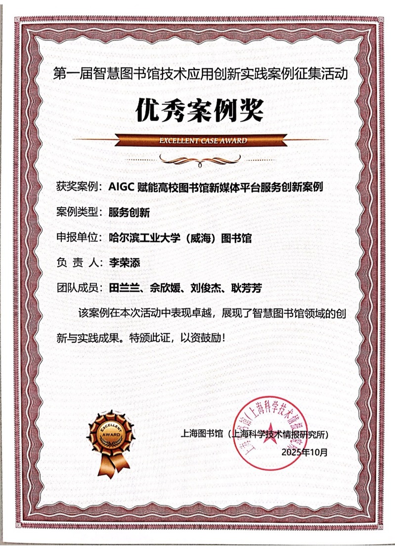 近日,上海图书馆(上海科学技术情报研究所)公布第一届智慧图书馆技术应用创新实践案例征集活动评审结果。校区图书馆提报的《AIGC 赋能高校图书馆新媒体平台服务创新案例》经专家评审团严格遴选与专业评议,从全国众多参评项目中脱颖而出,成功斩获“优秀案例奖”,充分彰显了校区图书馆在智慧服务领域的创新实践与显著成效。