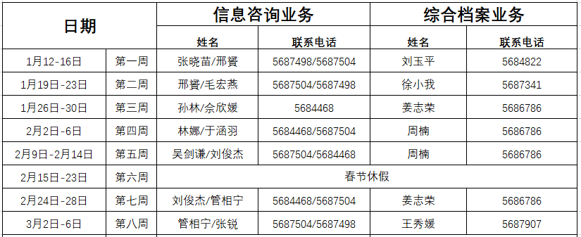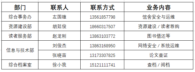 寒假期间各部门业务联系方式: