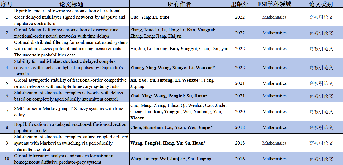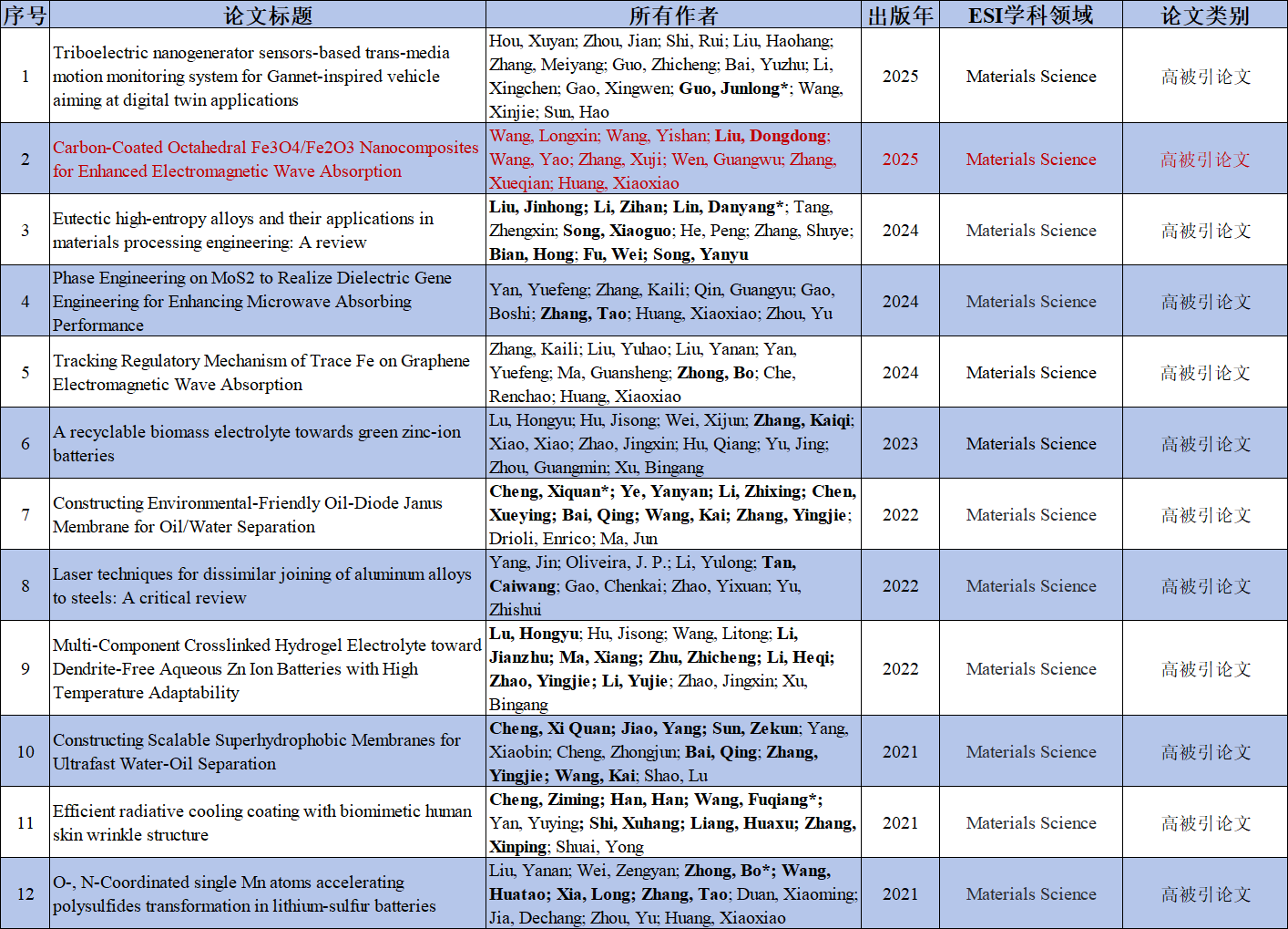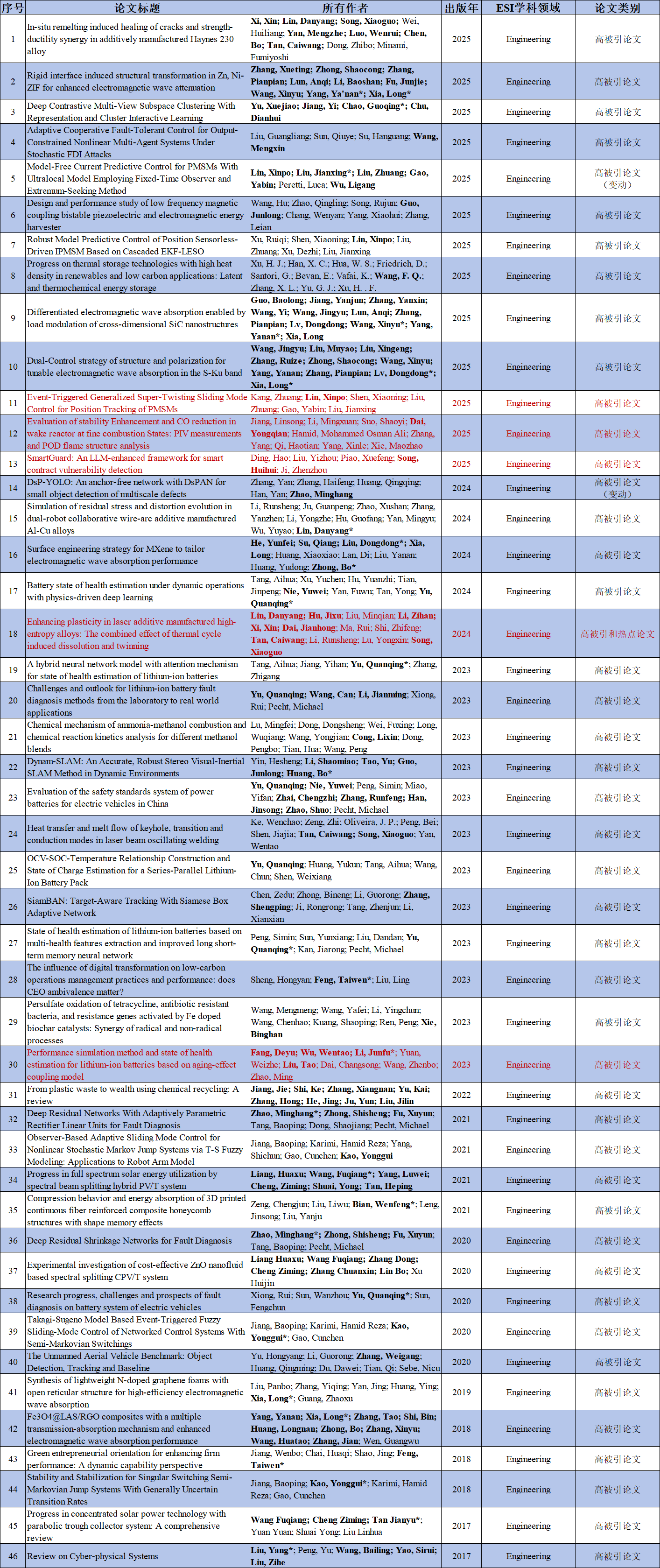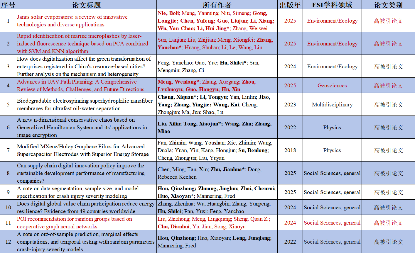 100篇ESI高影响力论文题录信息如下(以投稿标注地址为依据,粗体标识为我校区作者,*为我校区通讯作者(含共同通讯),深红色字体为本期新增论文)。