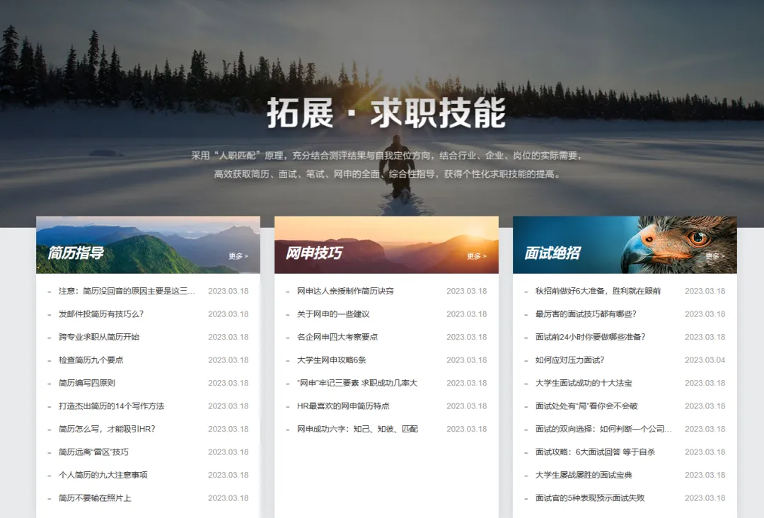 聚焦大学生最关心的求职与发展问题,平台提供职业规划、职业兴趣探索、简历优化、面试技巧、职场沟通、岗位解析、创业基础辅导等内容。从 “怎么找工作” 到 “如何做好工作” 全覆盖,帮助大家提前适应职场,提升综合竞争力。