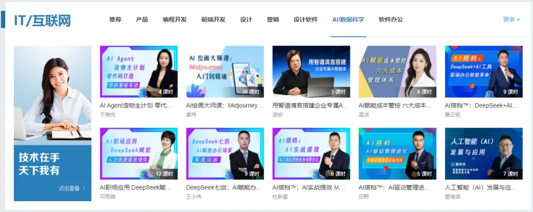 平台提供覆盖 AI工具、办公效率、编程开发、数据分析、创意设计、互联网运营的全品类技能课程,从零基础到职场进阶全覆盖。汇聚DeepSeek、ChatGPT等主流AI工具实战课程,助力用AI提升办公与职场效能;同时配套Office高阶技巧、Python编程、SPSS数据分析、PS/视频剪辑、互联网运营等实用内容,帮你夯实数字化能力,高效完成学业、提升求职硬实力。