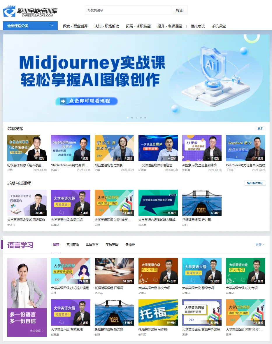 《职业全能培训库》是以就业为导向的综合性多媒体教育培训平台,全程服务大学生职业生涯发展,为职业规划、学业提升、求职就业、技能强化、创业准备等提供系统学习支持,助力同学们全面提升就业能力与综合素养。平台覆盖语言学习、求职就业、IT技能、职业考证、职业测评等核心学习场景,一站式满足在校学习、技能提升与职业发展需求,校内可免费便捷使用。